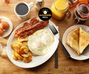 While most restaurants serve small standard eggs with their breakfasts and mixed ingredients Sunnyside Grill was determined to maintain the highest quality and integrity of the original delicious home cooking and go the extra mile! Sunnyside serves the highest quality gradeAA large eggs (fresher than the standard A used elsewhere), a blend of pork and beef make the Sunnyside sausages extra tasty and nutritious, while the premium grade bacon is evident even with a glance! Not to mention the taste! So make sure to stop by your local Sunnyside Grill!